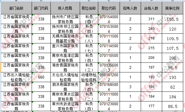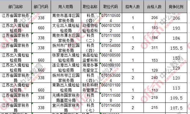 報(bào)名通過審核人數(shù)前十的職位主要集中在江蘇省國家稅務(wù)局、江蘇出入境檢驗(yàn)檢疫局,具體信息如下: