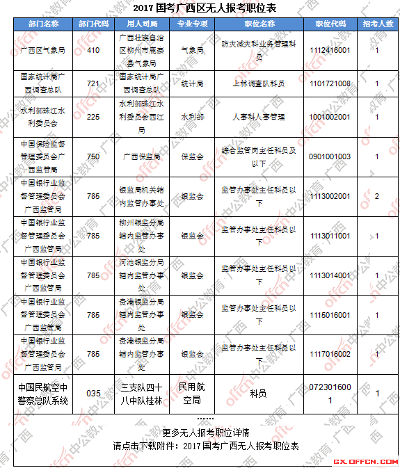 截止到19日8時,工作地點(diǎn)在廣西的職位共有66個無人報考,占全部職位的10.3%。下面是部分廣西無人報考職位一覽表,更多無人報考職位詳情請下載附件,廣西中公網(wǎng)校專家建議廣大考生結(jié)合自身?xiàng)l件,根據(jù)自己的實(shí)際情況找到屬于自己的職位,避免激烈競爭。
