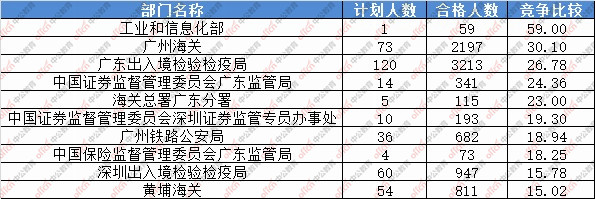為幫助廣大考生更清晰的了解今日報名情況,廣東中公網(wǎng)校整理了審核通過人數(shù)前十位的部門以及競爭比例最激烈的十大部門,供廣大考生參考: