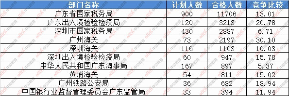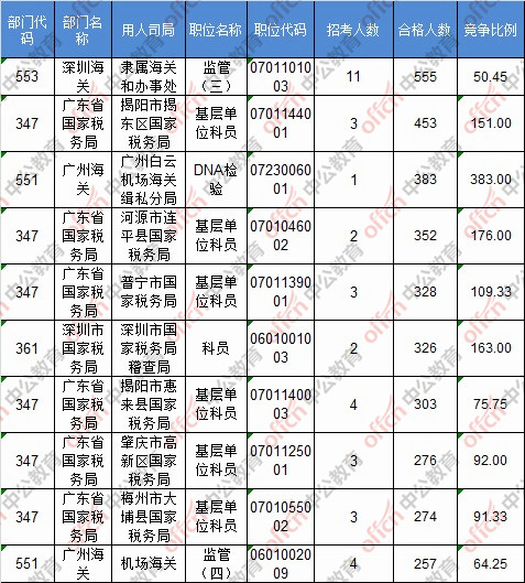 報名通過審核人數(shù)前十的職位主要集中在深圳海關(guān)、廣東省國家稅務(wù)局、廣州海關(guān),具體信息如下: