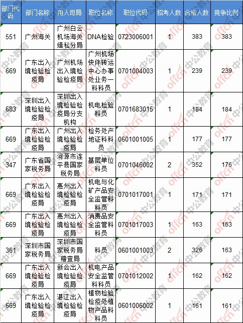 截止到19日8時,競爭比例的職位為廣州海關(guān)廣州白云機場海關(guān)緝私分局DNA檢驗一職,招錄1人,截止到19日8時通過人數(shù)為383人。