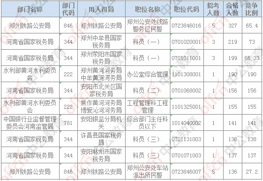報名通過審核人數(shù)排名前列的職位主要集中在鄭州鐵路公安局、河南省國家稅務局,水利部黃河水利委員會,具體信息如下: