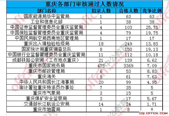 截止到19日8時,各部門報名人數(shù)已陸續(xù)上漲,有幾個部門報考人數(shù)都已經(jīng)上百了,其中有中國證券監(jiān)督管理委員會重慶監(jiān)管局、重慶出入境檢驗檢疫局、國家統(tǒng)計局重慶調(diào)查總隊、中國銀行業(yè)監(jiān)督管理委員會重慶監(jiān)管局、成都鐵路公安局(工作地點重慶)、重慶市國家稅務(wù)局;截至統(tǒng)計時間:重慶市國家稅務(wù)局共報名3369人,出入境檢驗檢疫局共報名249人,兩部門合2264人,共占了總報名人數(shù)的78%!相對前幾天有所下降。