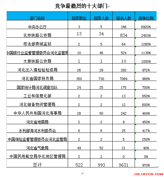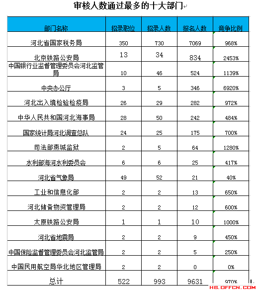 為幫助廣大考生更清晰的了解今日?qǐng)?bào)名情況,河北中公網(wǎng)校整理了審核通過人數(shù)前十位的部門以及競(jìng)爭(zhēng)比例最激烈的十大部門,供廣大考生參考: