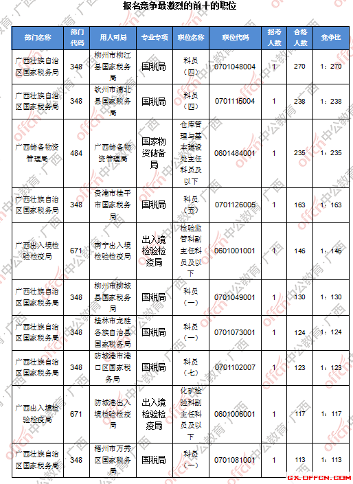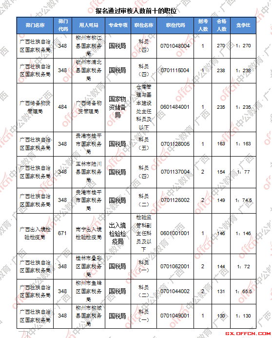 報名通過審核人數(shù)前十的職位主要集中在廣西壯族自治區(qū)國家稅務(wù)局、廣西儲備物資管理局、廣西出入境檢驗(yàn)檢疫局等部門,具體信息如下:
