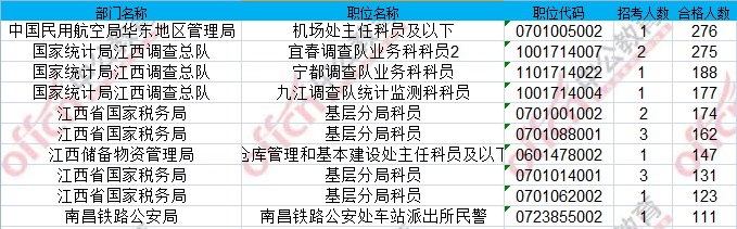 報(bào)名通過審核人數(shù)前十的職位主要集中在江西省國家稅務(wù)局、國家統(tǒng)計(jì)局江西調(diào)查總隊(duì)具體信息如下: