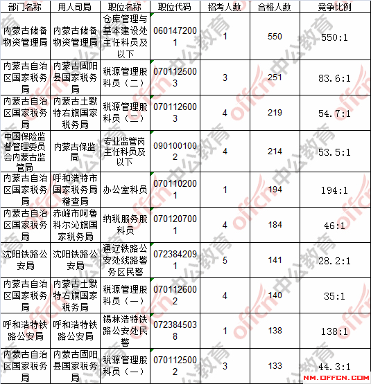 報名通過審核人數(shù)前十的職位主要集中在內蒙古儲備物資管理局、內蒙古固陽縣國家稅務局、內蒙古土默特右旗國家稅務局等部門,具體信息如下:
