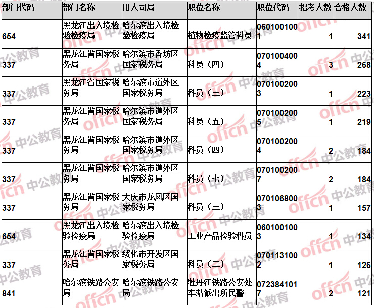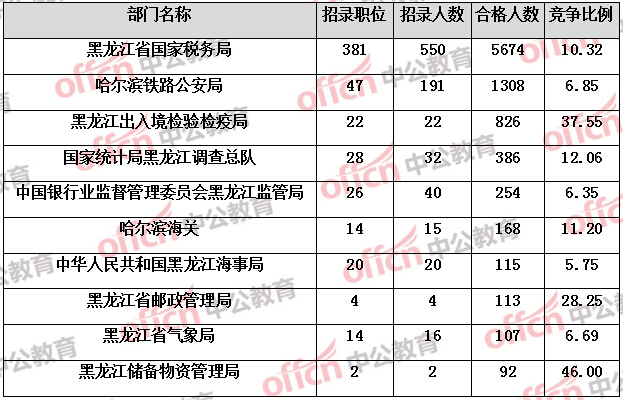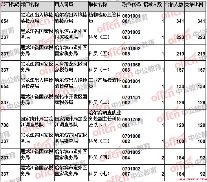 報名通過審核人數(shù)前十的職位主要集中在黑龍江省國家稅務局、黑龍江出入境檢驗檢疫局、哈爾濱鐵路公安局等部門,具體信息如下:
