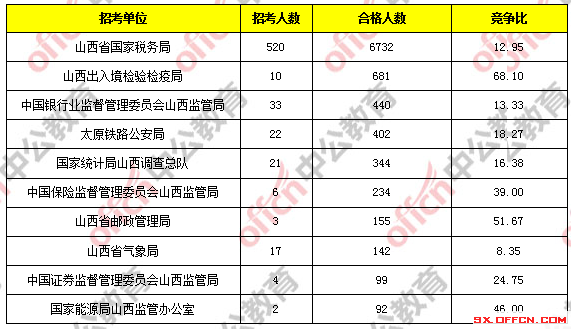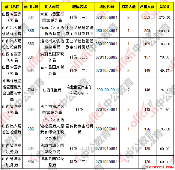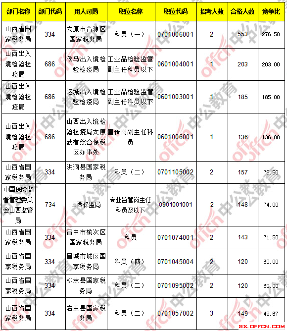 報(bào)考人數(shù)前十的職位主要集中在山西省國家稅務(wù)局、山西出入境檢驗(yàn)檢疫局這兩個(gè)部門,具體信息如下: