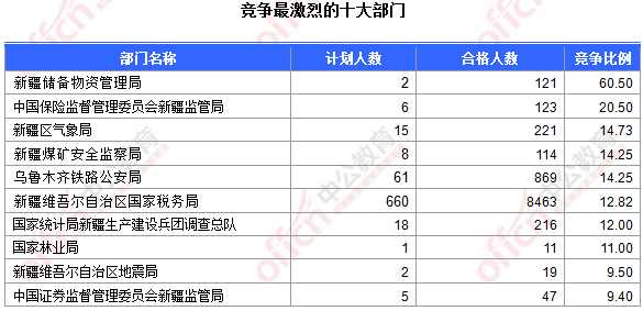 為幫助廣大考生更清晰的了解今日報名情況,新疆中公網(wǎng)校整理了審核通過人數(shù)前十位的部門以及競爭比例最激烈的十大部門,供廣大考生參考: