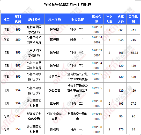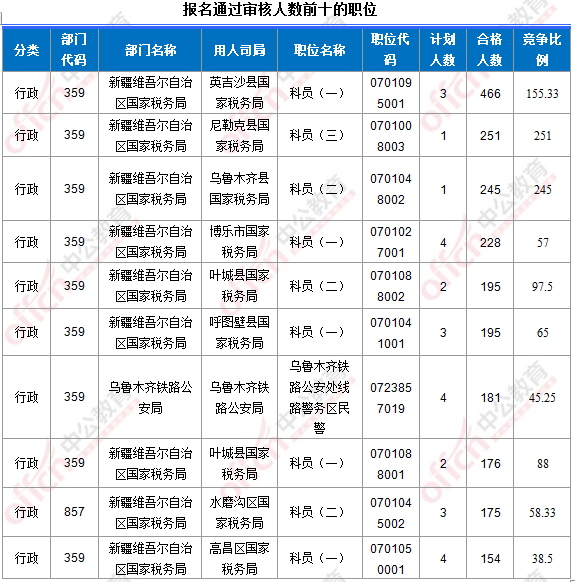 報名通過審核人數(shù)前十的職位主要集中在新疆維吾爾自治區(qū)國家稅務局、烏魯木齊鐵路公安局等部門,具體信息如下: