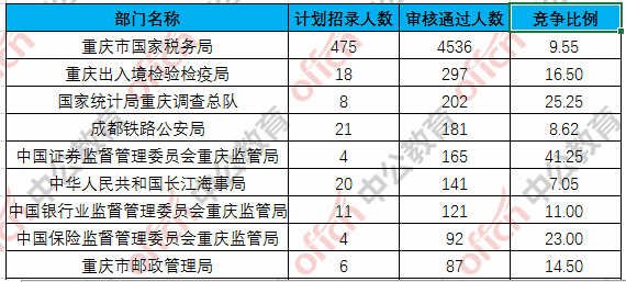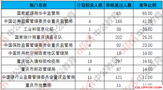 為幫助廣大考生更清晰的了解今日?qǐng)?bào)名情況,重慶中公網(wǎng)校整理了合格人數(shù)前十位的部門以及競(jìng)爭(zhēng)比例最激烈的十大部門,供廣大考生參考: