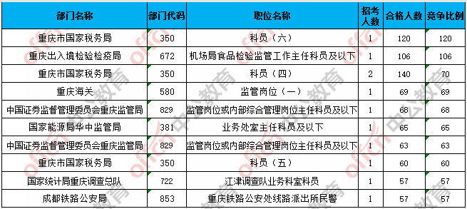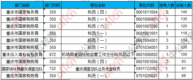 合格人數(shù)前十的職位主要集中在重慶市國家稅務(wù)局、重慶出入境檢驗檢疫局、國家統(tǒng)計局重慶調(diào)查總隊等部門,具體信息如下: