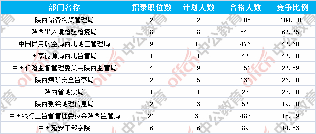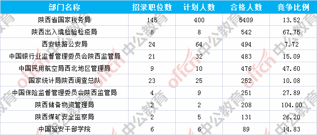 為幫助廣大考生更清晰的了解今日報名情況,陜西中公教育整理了審核通過人數(shù)前十位的部門以及競爭比例最激烈的十大部門,供廣大考生參考: