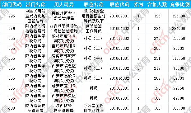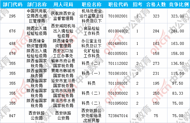 報(bào)名通過(guò)審核人數(shù)前十的職位主要集中在陜西出入境檢驗(yàn)檢疫局、陜西省國(guó)家稅務(wù)局、中國(guó)民用航空局西北地區(qū)管理局等部門,具體信息如下:
