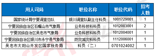截止到20日8時(shí),工作地點(diǎn)在寧夏的職位共有5個(gè)無(wú)人報(bào)考。下面是無(wú)人報(bào)考職位一覽表,中公網(wǎng)校專(zhuān)家建議廣大考生多關(guān)注一些較冷職位,避免激烈競(jìng)爭(zhēng),結(jié)合自身?xiàng)l件,找到屬于自己的職位。