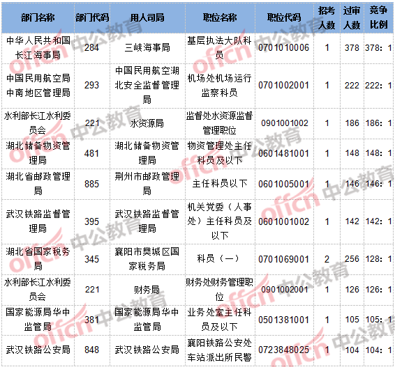 截止到10月20日8時,報名通過審核人數(shù)和競爭比例的職位為三峽海事局基層執(zhí)法大隊科員一職,招錄1人,過審人數(shù)378人,競爭比例為378:1。具體信息如下: