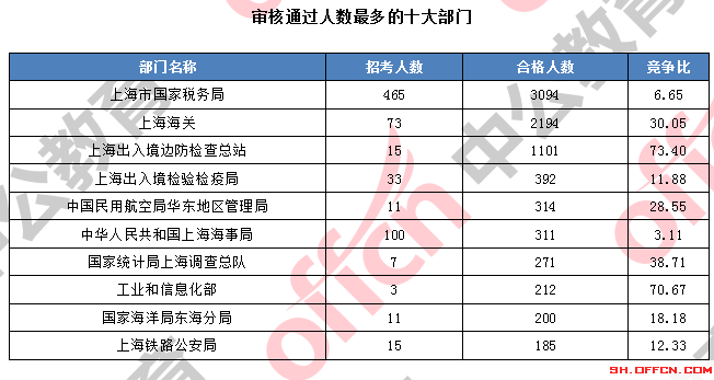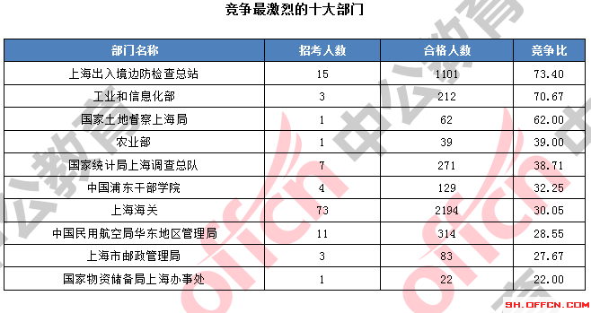 為幫助廣大考生更清晰的了解今日報名情況,上海中公網(wǎng)校整理了審核通過人數(shù)前十位的部門以及競爭比例最激烈的十大部門,供廣大考生參考: