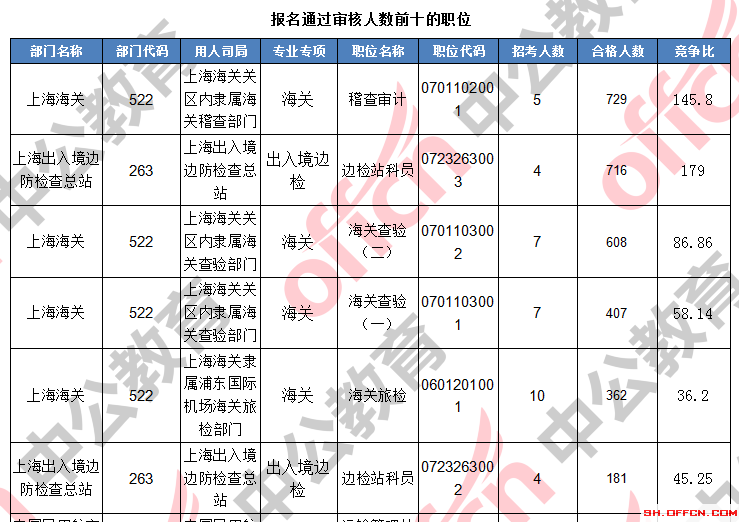 報名通過審核人數(shù)前十的職位主要集中在上海出上海海關(guān)、上海出入境邊防檢查總站、中國民用航空局華東地區(qū)管理局,具體信息如下: