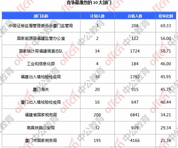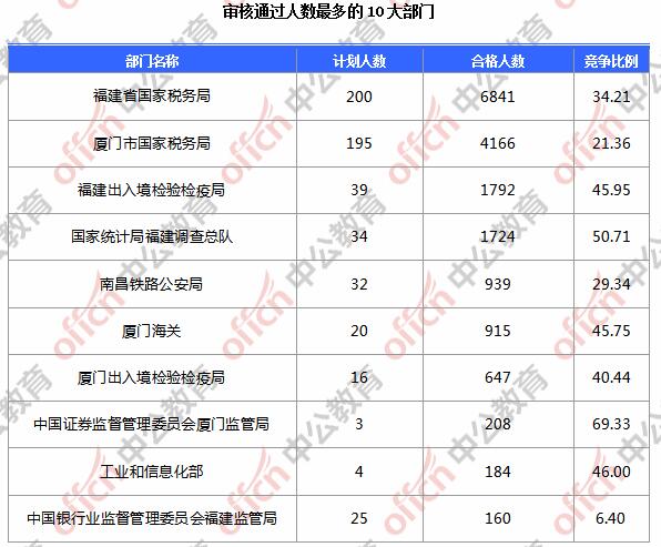 為幫助廣大考生更清晰的了解今日?qǐng)?bào)名情況,福建中公網(wǎng)校整理了審核通過人數(shù)前10位的部門以及競(jìng)爭(zhēng)比例最激烈的10大部門,供廣大考生參考: