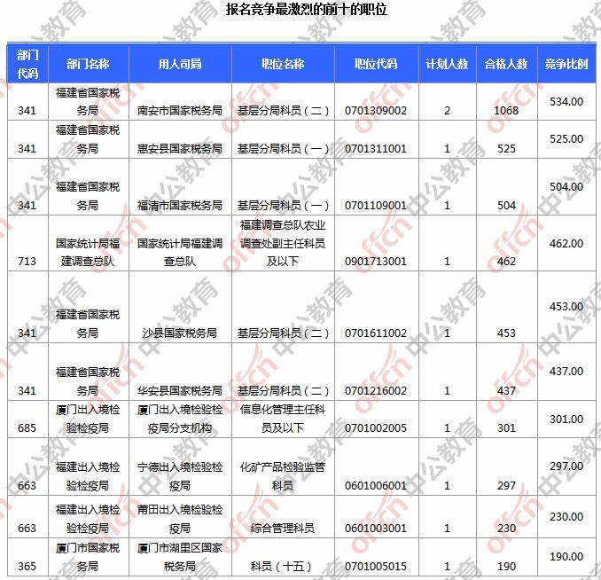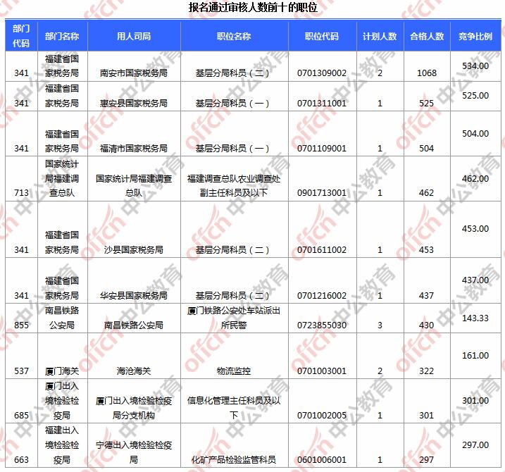 報(bào)名通過審核人數(shù)前十的職位主要集中在南安市國家稅務(wù)局、惠安縣國家稅務(wù)局、福清市國家稅務(wù)局等部門,具體信息如下:
