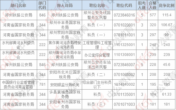 報名通過審核人數(shù)排名前列的職位主要集中在鄭州鐵路公安局、河南省國家稅務(wù)局,水利部黃河水利委員會,具體信息如下:
