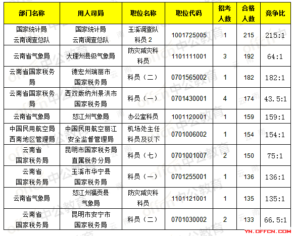 截止20日16時(shí),競(jìng)爭(zhēng)最激烈的職位為國(guó)家統(tǒng)計(jì)局云南調(diào)查總隊(duì)_國(guó)家統(tǒng)計(jì)局云南調(diào)查總隊(duì)(玉溪調(diào)查隊(duì)科員2),職位代碼1001725005,招錄1人,通過(guò)人數(shù)為215人,215:1。