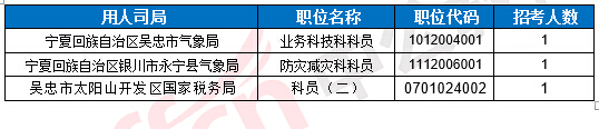 截止到20日16時(shí),工作地點(diǎn)在寧夏的職位共有3個(gè)無人報(bào)考。下面是無人報(bào)考職位一覽表,中公網(wǎng)校專家建議廣大考生多關(guān)注一些較冷職位,避免激烈競爭,結(jié)合自身?xiàng)l件,找到屬于自己的職位。