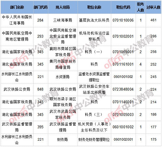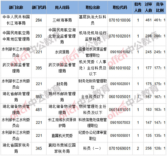 截止到10月20日16時(shí),報(bào)名通過審核人數(shù)和競爭比例的職位為三峽海事局基層執(zhí)法大隊(duì)科員一職,招錄1人,過審人數(shù)461人,競爭比例為461:1。具體信息如下: