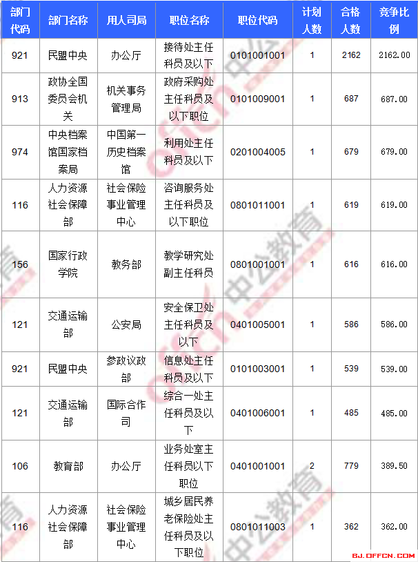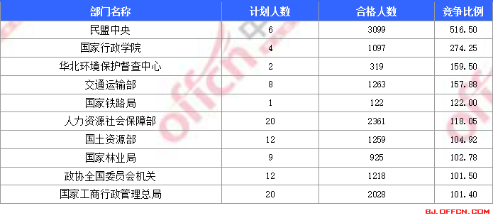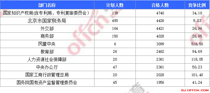 為幫助廣大考生更清晰的了解今日報名情況,北京中公網(wǎng)校整理了合格人數(shù)前十位的部門以及競爭比例最激烈的十大部門,供廣大考生參考:
