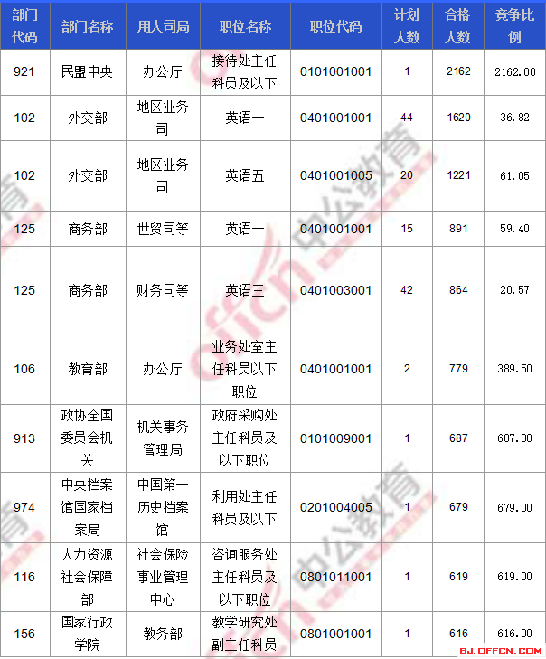 合格人數(shù)前十的職位主要集中在外交部、民盟中央、商務(wù)部等部門,具體信息如下: