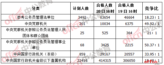 各系統(tǒng)競爭比排名沒有發(fā)生變化,中央黨群機(jī)關(guān)參照公務(wù)員法管理事業(yè)單位依舊占據(jù)首位,競爭比最激烈,目前已達(dá):50.37:1,中央黨群機(jī)關(guān)緊隨其后,競爭比為49.92:1,以上數(shù)據(jù)說明,考生們進(jìn)入中央部委的愿望比較強(qiáng)烈,但中央機(jī)關(guān)職位采用副省及以上試卷,難度要高于地市級(jí)試卷,考生們要慎重選擇。