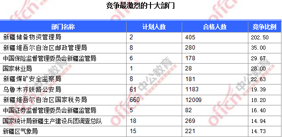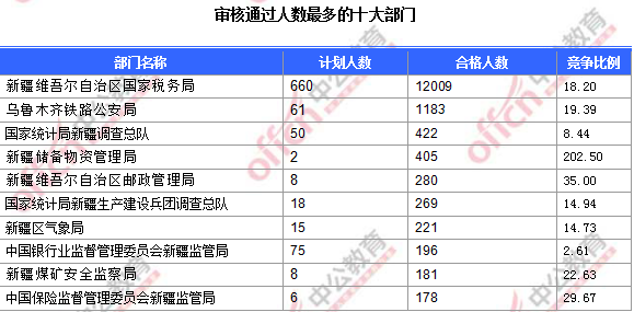 為幫助廣大考生更清晰的了解今日?qǐng)?bào)名情況,中公網(wǎng)校中公網(wǎng)校整理了審核通過人數(shù)前十位的部門以及競(jìng)爭比例最激烈的十大部門,供廣大考生參考: