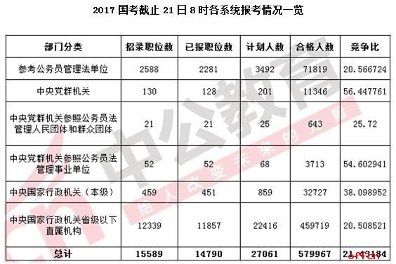10月21日,2017國家公務(wù)員考試報(bào)名已經(jīng)進(jìn)入了倒計(jì)時(shí)階段,據(jù)報(bào)名結(jié)束還有最后的4天,中公網(wǎng)校專家提醒各位考生盡快報(bào)考,留足48小時(shí)資格審查的時(shí)間,以防不通過耽誤二次填報(bào)。據(jù)中公網(wǎng)校數(shù)據(jù)統(tǒng)計(jì),截至21日8時(shí),報(bào)名系統(tǒng)已經(jīng)審核通過了579967人,遠(yuǎn)超去年同期的50萬。較昨天下午的數(shù)據(jù)相比,報(bào)名合格人數(shù)增加了58847人,平均競爭比為21:1。民盟中央辦公廳接待處主任科員及以下(職位代碼為101001001)職位依然為競爭比最熱的職位,競爭比2610:1。與其熱度相反的是,目前仍有799個崗位報(bào)考人數(shù)還未破零,占5.1%。從各系統(tǒng)無人報(bào)考情況看,目前“中央黨群機(jī)關(guān)參照公務(wù)員管理法管理事業(yè)單位”及“中央黨群機(jī)關(guān)參照公務(wù)員法管理人民團(tuán)體和群眾團(tuán)體”兩個系統(tǒng)所有職位已經(jīng)全部有人過審,中央黨群機(jī)關(guān)僅有2職位無人過審。