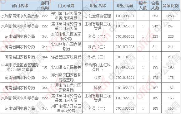 截止21日8時,招錄比例的職位為鄭州黃河河務局中牟黃河河務局辦公室綜合管理一職,招錄1人,截止21日8時通過人數為253人。