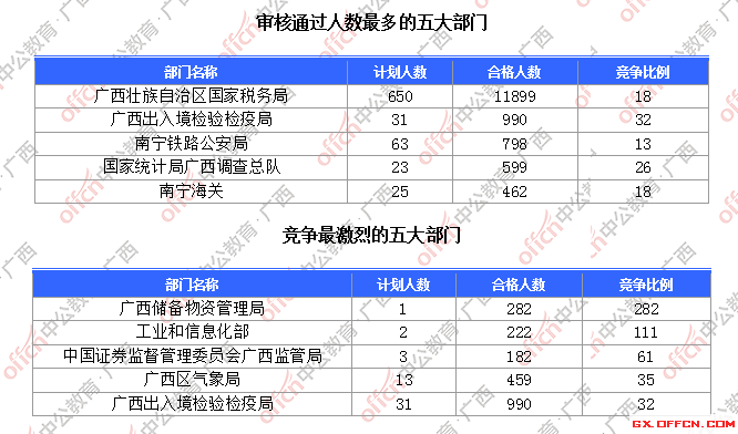 為幫助廣大考生更清晰的了解今日?qǐng)?bào)名情況,廣西中公網(wǎng)校整理了審核通過人數(shù)前五位的部門以及競(jìng)爭(zhēng)比例最激烈的五大部門,供廣大考生參考: