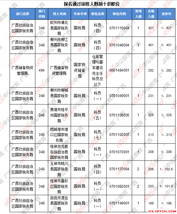 報(bào)名通過審核人數(shù)前十的職位主要集中在廣西壯族自治區(qū)國(guó)家稅務(wù)局、廣西儲(chǔ)備物資管理局等部門,具體信息如下: