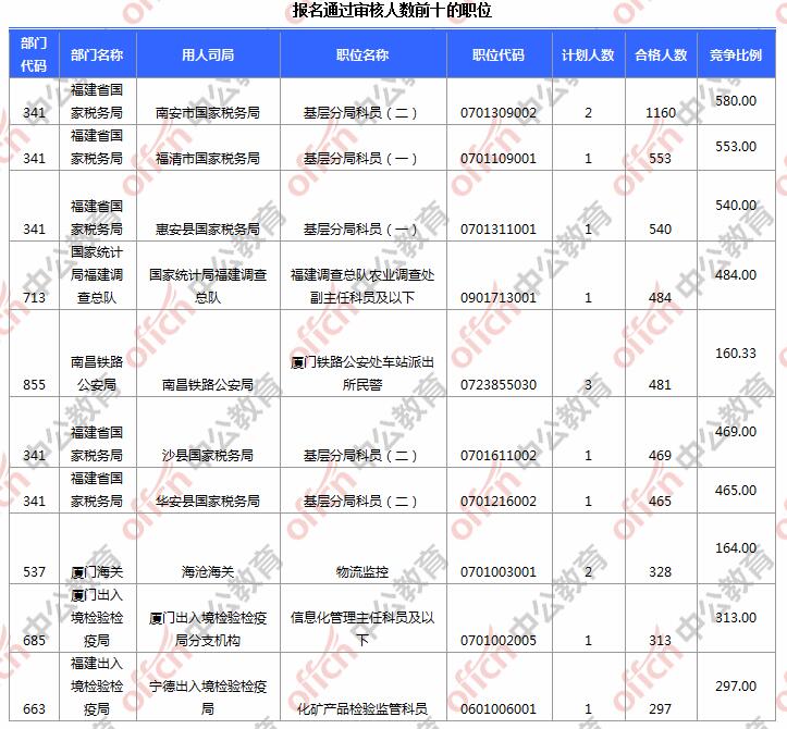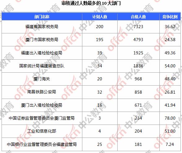 為幫助廣大考生更清晰的了解今日報名情況,福建中公網(wǎng)校整理了審核通過人數(shù)前10位的部門以及競爭比例最激烈的10大部門,供廣大考生參考: