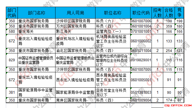 報名通過審核人數(shù)前十的職位主要集中在萬州區(qū)國家稅務(wù)局、渝北區(qū)國家稅務(wù)局、沙坪壩區(qū)國家稅務(wù)局等部門,具體信息如下: