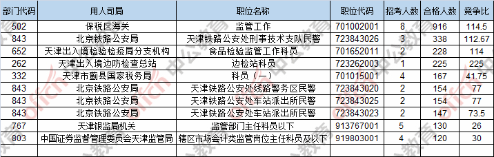 報(bào)名通過審核人數(shù)前十的職位主要集中在保稅區(qū)海關(guān)、北京鐵路公安局、天津出入境檢驗(yàn)檢疫局分支機(jī)構(gòu),具體信息如下: