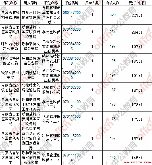 報(bào)名通過(guò)審核人數(shù)前十的職位主要集中在內(nèi)蒙古儲(chǔ)備物資管理局、內(nèi)蒙古固陽(yáng)縣國(guó)家稅務(wù)局、內(nèi)蒙古土默特右旗國(guó)家稅務(wù)局等部門,具體信息如下: