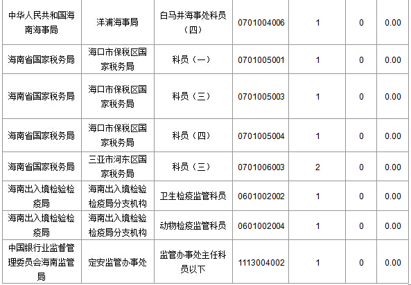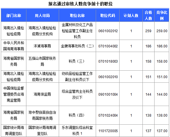 報(bào)名通過(guò)審核人數(shù)前十的職位主要集中在海南出入境檢驗(yàn)檢疫局、海南省國(guó)家稅務(wù)局、中華人民共和國(guó)海南海事局等部門,具體信息如下: