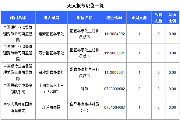 截至21日16時(shí),海南地區(qū)仍有12個(gè)職位無(wú)人報(bào)考。下面列舉部分職位展示,中公網(wǎng)校專家建議廣大考生多關(guān)注一些較冷職位,避免激烈競(jìng)爭(zhēng),結(jié)合自身?xiàng)l件,找到屬于自己的職位。