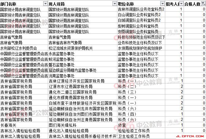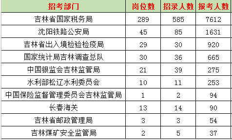 報名通過審核人數(shù)前十的職位主要集中在吉林省國稅局和吉林出入境檢驗(yàn)檢疫局,具體信息如下: