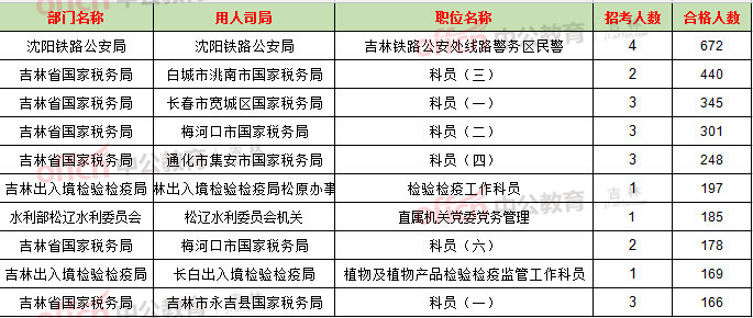 截止到21日16時,競爭比例的職位為吉林鐵路公安處線路警務(wù)區(qū)民警一職,招錄4人,截止到21日16時通過人數(shù)為672人。其次為吉林省國稅局部門。