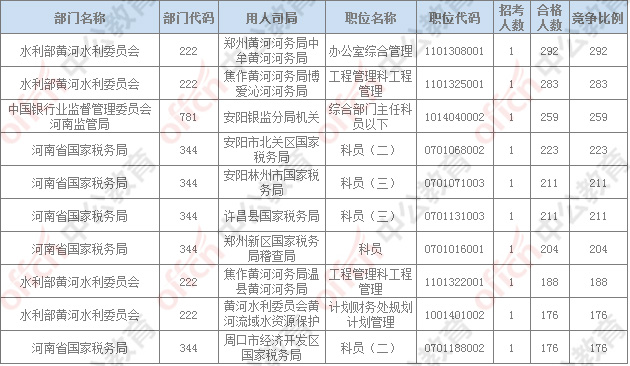 報名通過審核人數排名前列的職位主要集中在鄭州鐵路公安局、河南省國家稅務局,水利部黃河水利委員會,具體信息如下:
