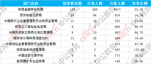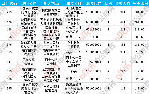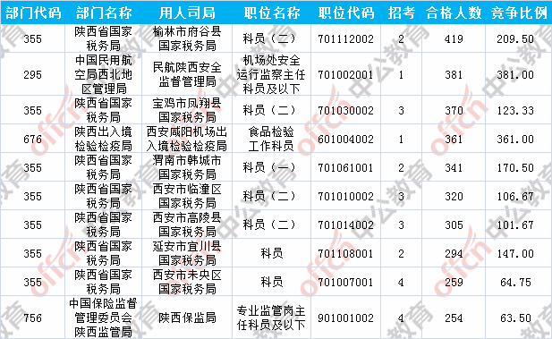 報(bào)名通過審核人數(shù)前十的職位主要集中在陜西出入境檢驗(yàn)檢疫局、陜西省國家稅務(wù)局、中國民用航空局西北地區(qū)管理局等部門,具體信息如下: