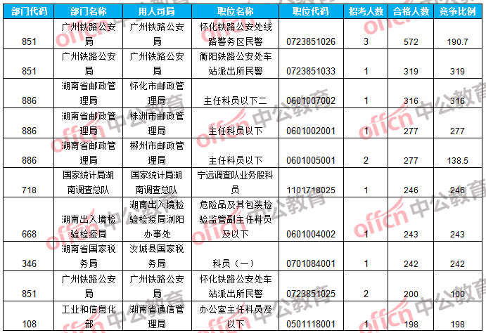 報(bào)名通過審核人數(shù)前十的職位主要集中在廣州鐵路公安局、國家統(tǒng)計(jì)局湖南調(diào)查總隊(duì)等部門,具體信息如下: