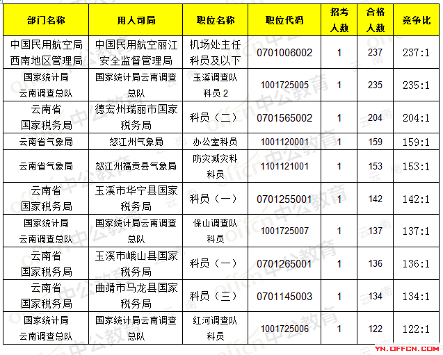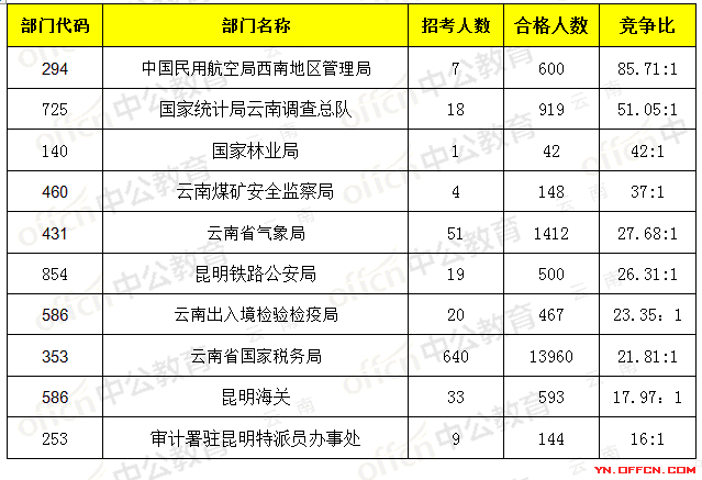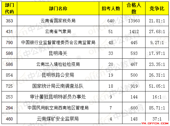 報名通過審核人數(shù)前十的職位主要集中在國家統(tǒng)計局云南調(diào)查總隊、云南省氣象局、云南省國家稅務(wù)局等部門,具體信息如下: