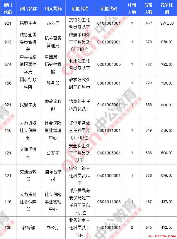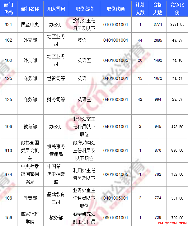合格人數(shù)前十的職位主要集中在外交部、民盟中央、商務(wù)部等部門,具體信息如下:
